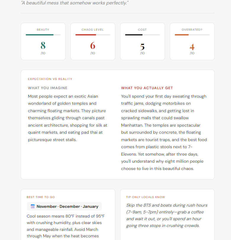Open honest.traveneur.com and type it in. Read the full review. Pay attention to the Chaos Score if you are sensitive to crowds. Check the Overrated rating if you are going because of a trend. Note the insider tip — it is usually the most useful thing on the page.